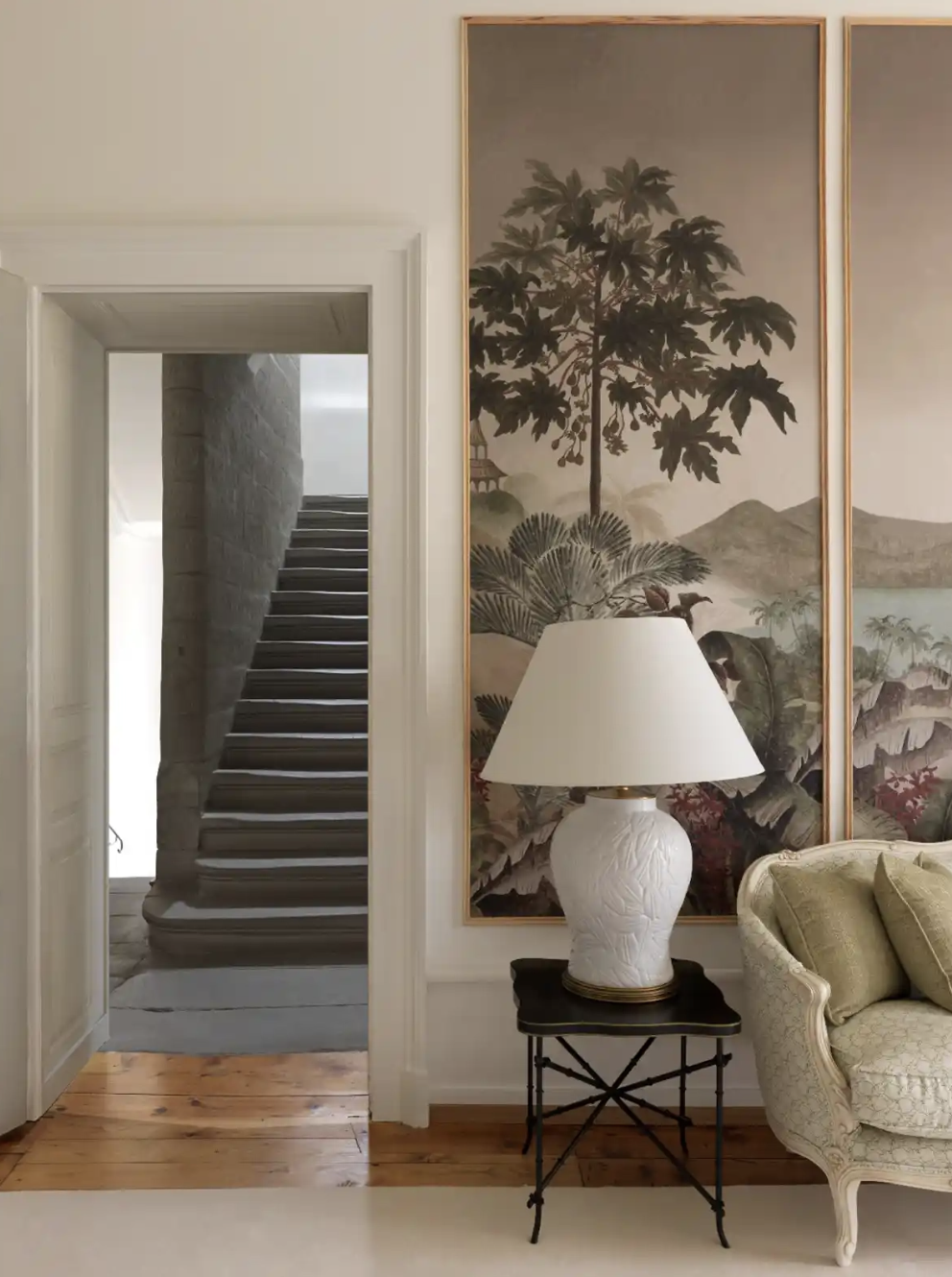 Oak surfaces, brass elements, and fabrics are treated with care and measure. Used this way, they form interiors that feel calm, personal, and enduring.